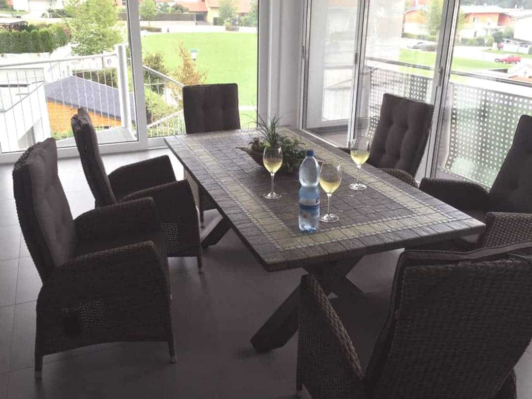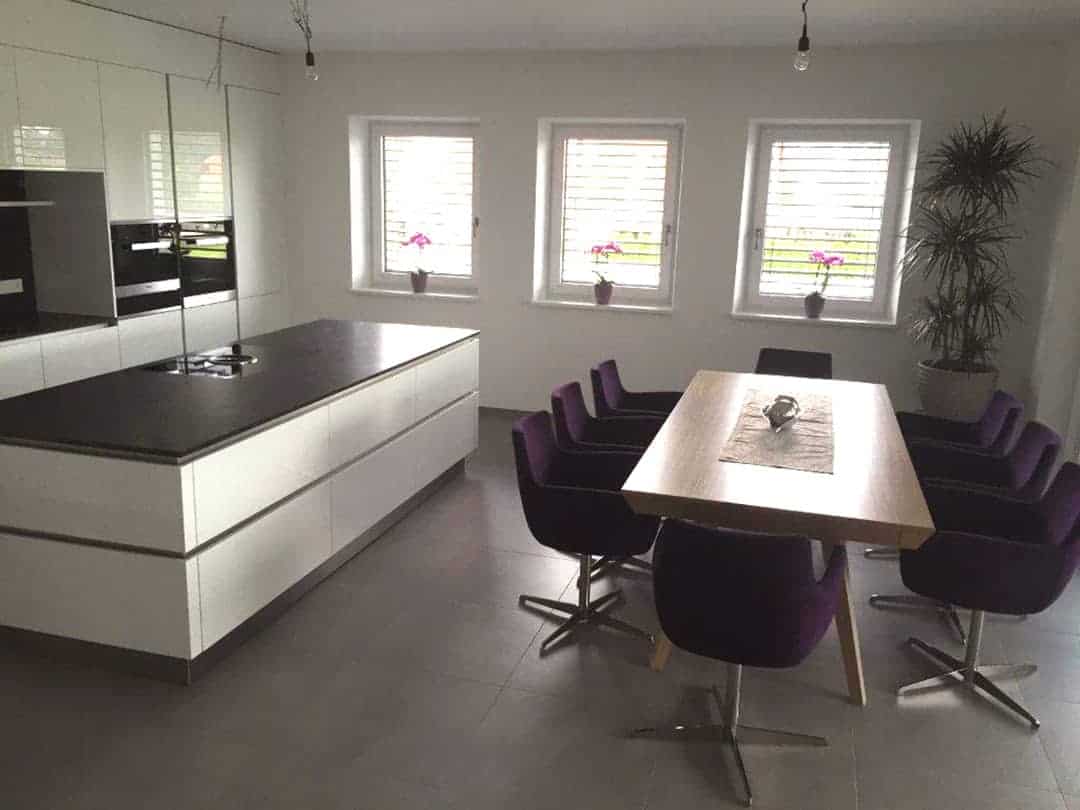 Der Zubau bietet eine großzügige Essküche mit viel Platz für die ganze Familie. Eine große Hebeschiebetür verbindet die Küche direkt mit dem angrenzenden Wintergarten, der lichtdurchfluteten Wohnkomfort schafft und als Erweiterung des Lebensraums dient. Vom Wintergarten aus führt eine elegante Wendeltreppe direkt in den Garten – ein praktisches wie auch gestalterisches Detail, das die Verbindung von Innen- und Außenbereich unterstreicht.