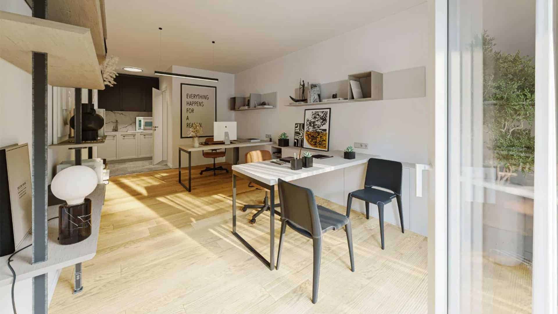 Nach Fertigstellung des Umbaus werden vier Büros zur Verfügung stehen, zwei im Erdgeschoss und zwei im Obergeschoss. Jedes Büro hat einen separaten Eingang, der entweder ebenerdig oder im Obergeschoss über eine Freitreppe und einen Laubengang erreichbar ist. Die Büros haben ein ähnliches Raumangebot, sind aber architektonisch individuell eingeteilt.
